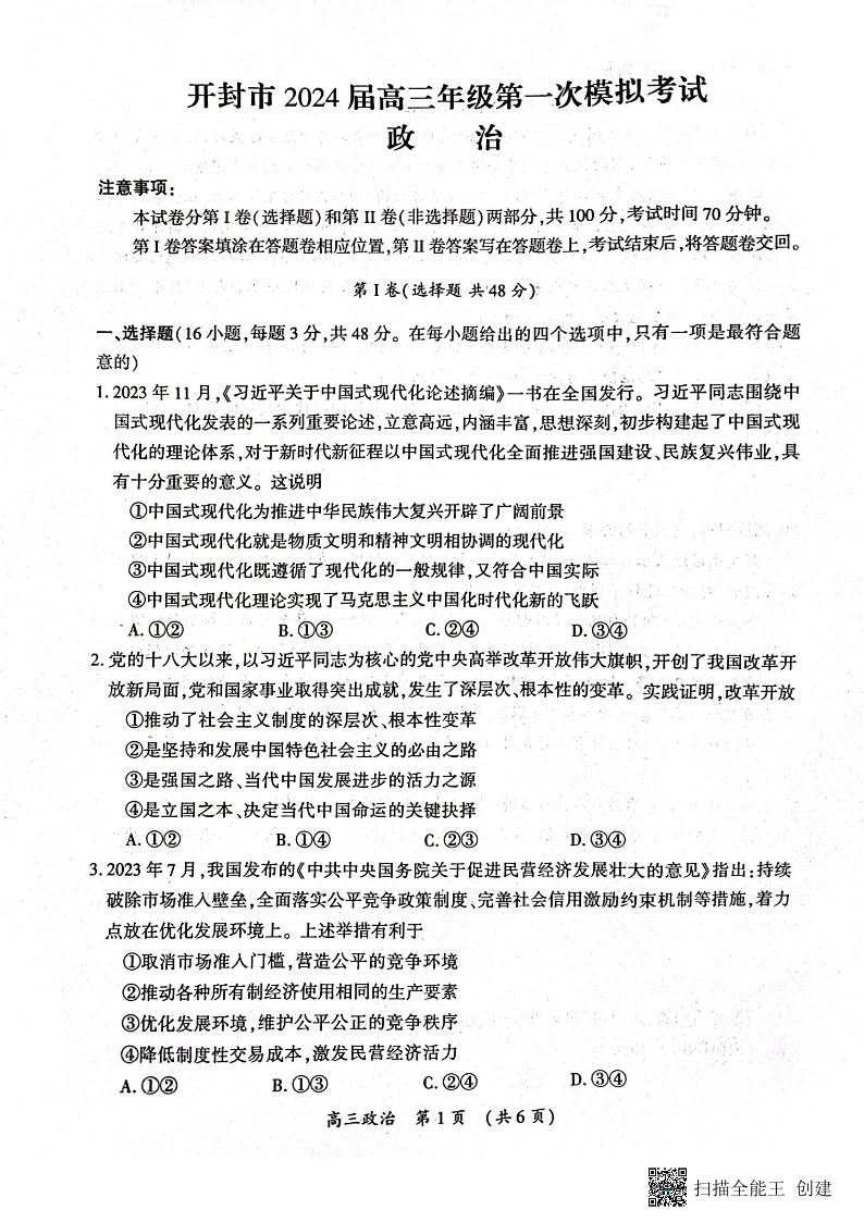 河南省开封市2023.12高三年级第一次模拟考试政治