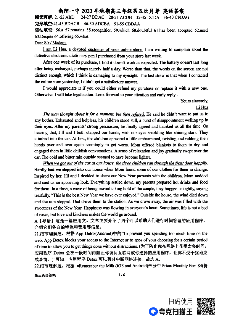 河南省南阳市第一中学2023.12高三年级第五次月考英语答案