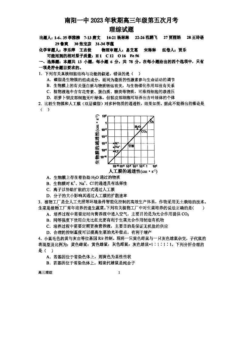 河南省南阳市第一中学2023.12高三年级第五次月考理科综合+答案解析
