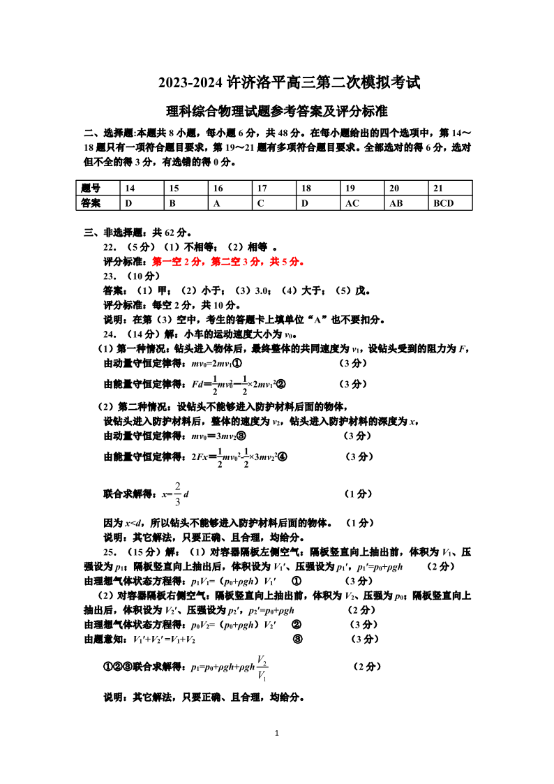 河南省四市许济洛平2024届高三第二次质量检测物理答案