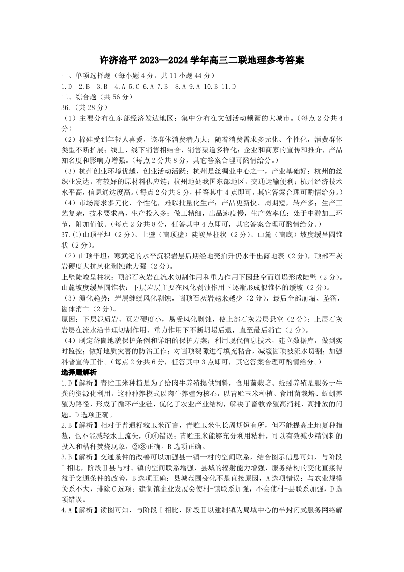 2024届河南省平许济洛四市高三上学期第二次质量检测地理答案