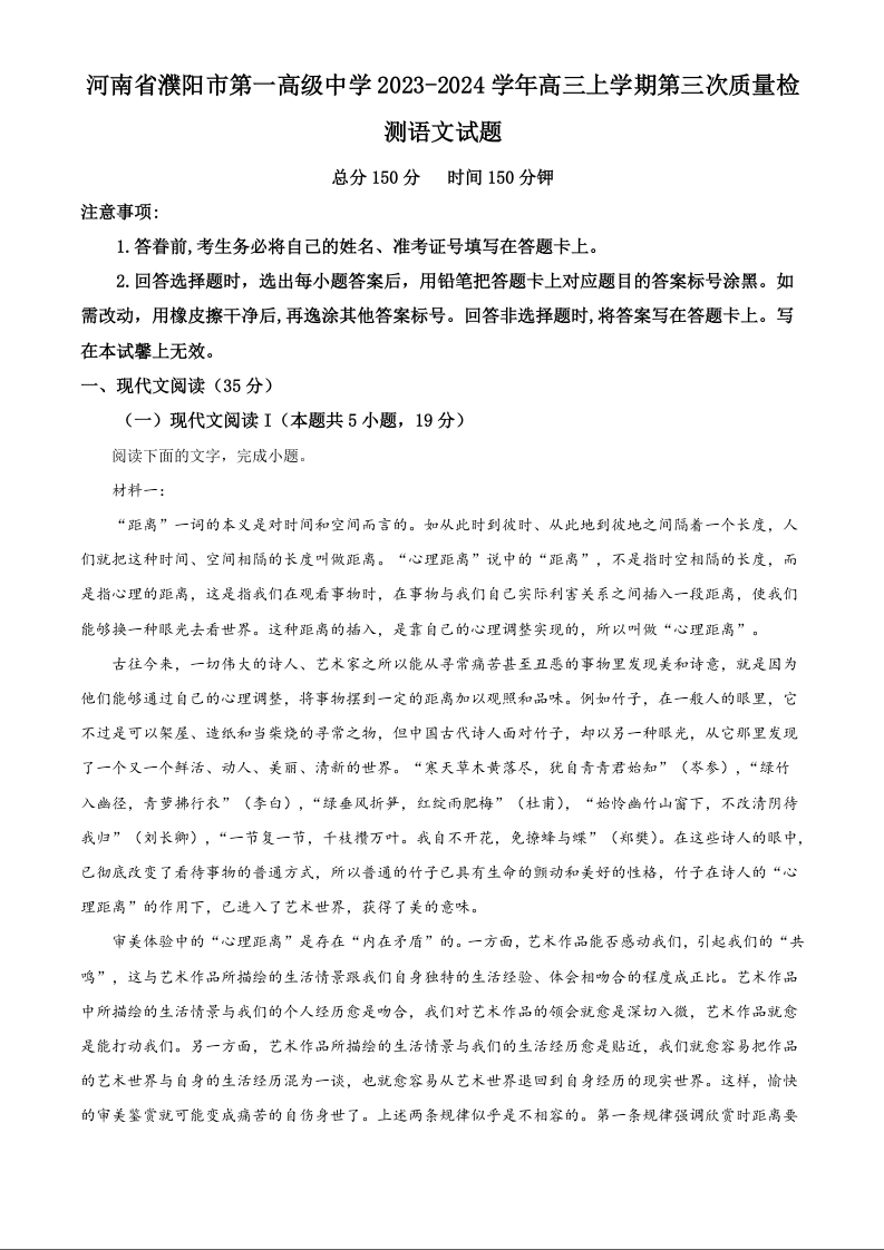 河南省濮阳市第一高级中学2024届高三上学期第三次质量检测语文+答案解析