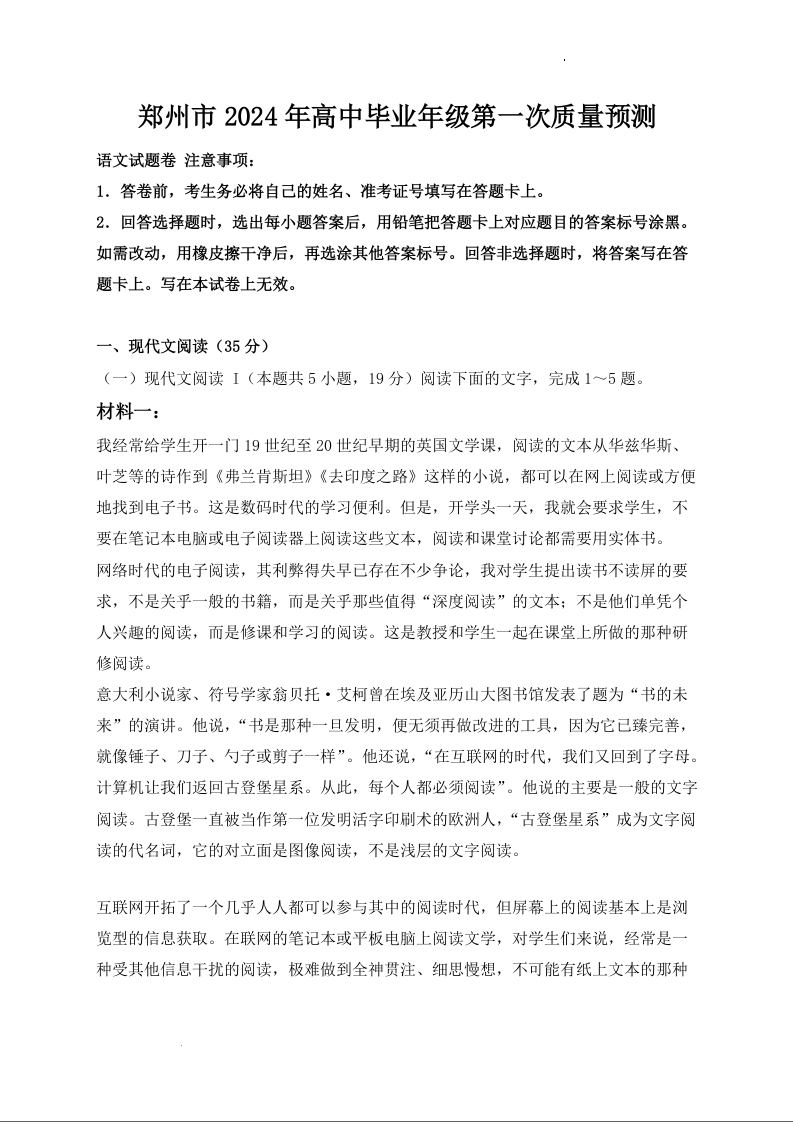 2024届河南省郑州市高中毕业年级第一次质量预测语文