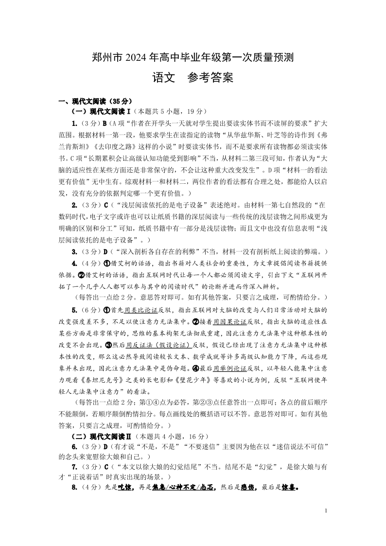 2024届河南省郑州市高中毕业年级第一次质量预测语文答案