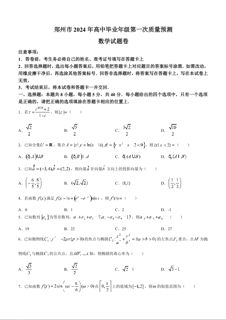 2024届河南省郑州市高中毕业年级第一次质量预测数学