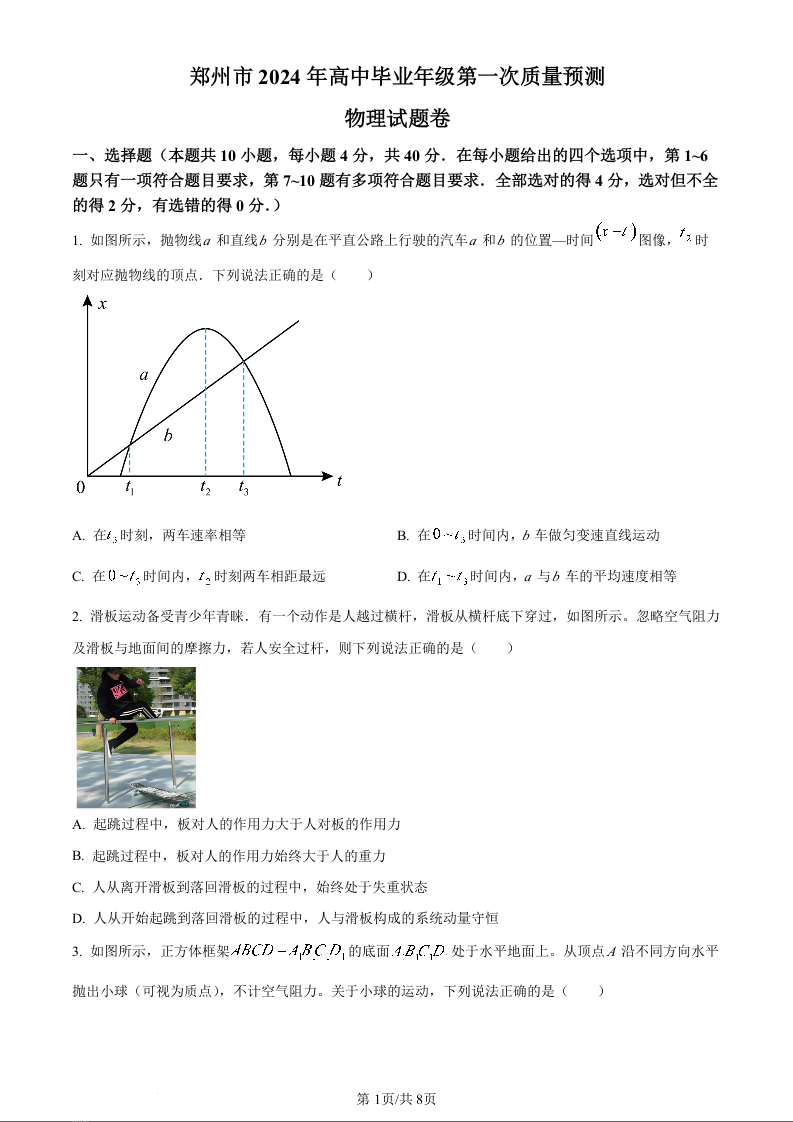 2024届河南省郑州市高三上学期一模物理试题(原卷版)