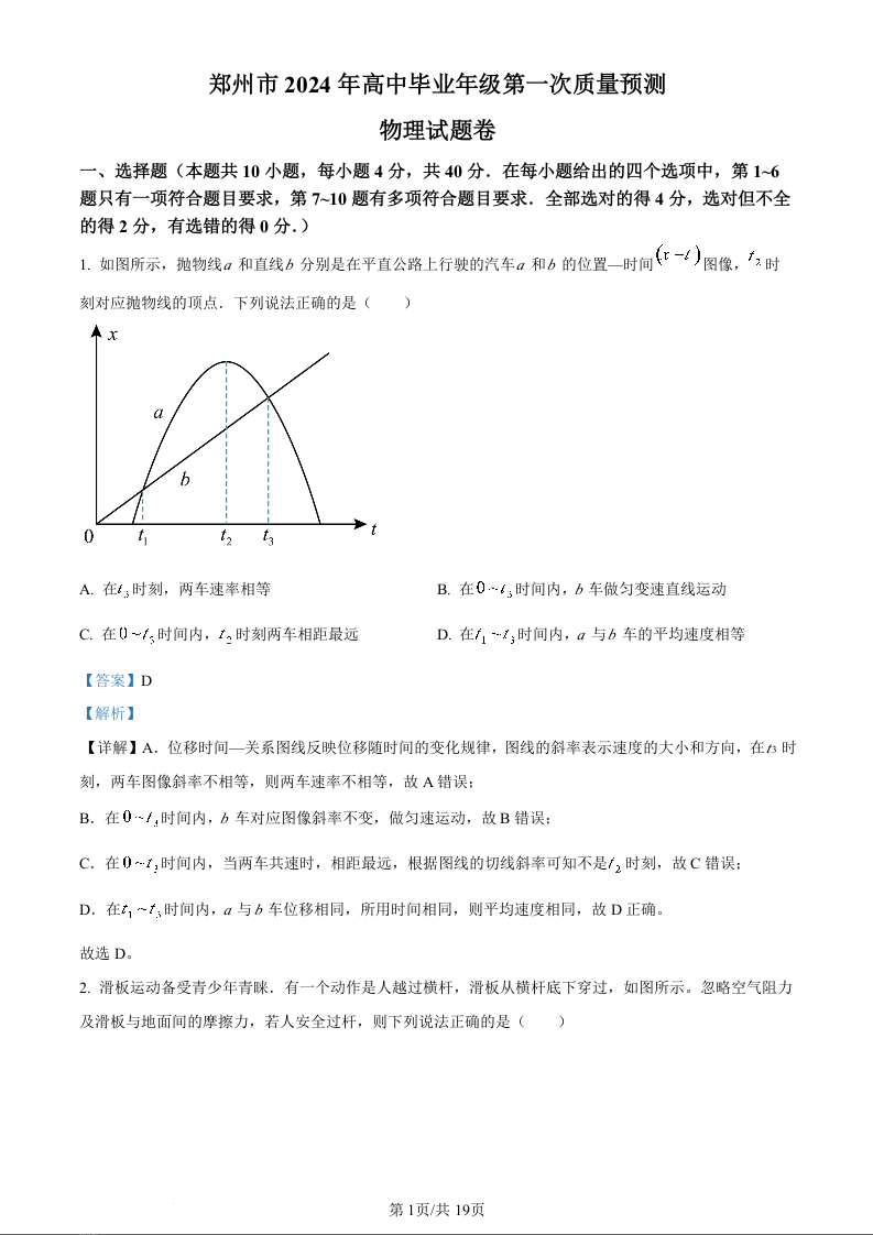 2024届河南省郑州市高三上学期一模物理试题(解析版)