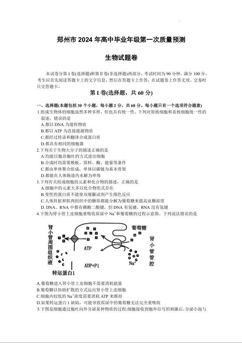 2024届河南省郑州市高中毕业年级第一次质量预测生物