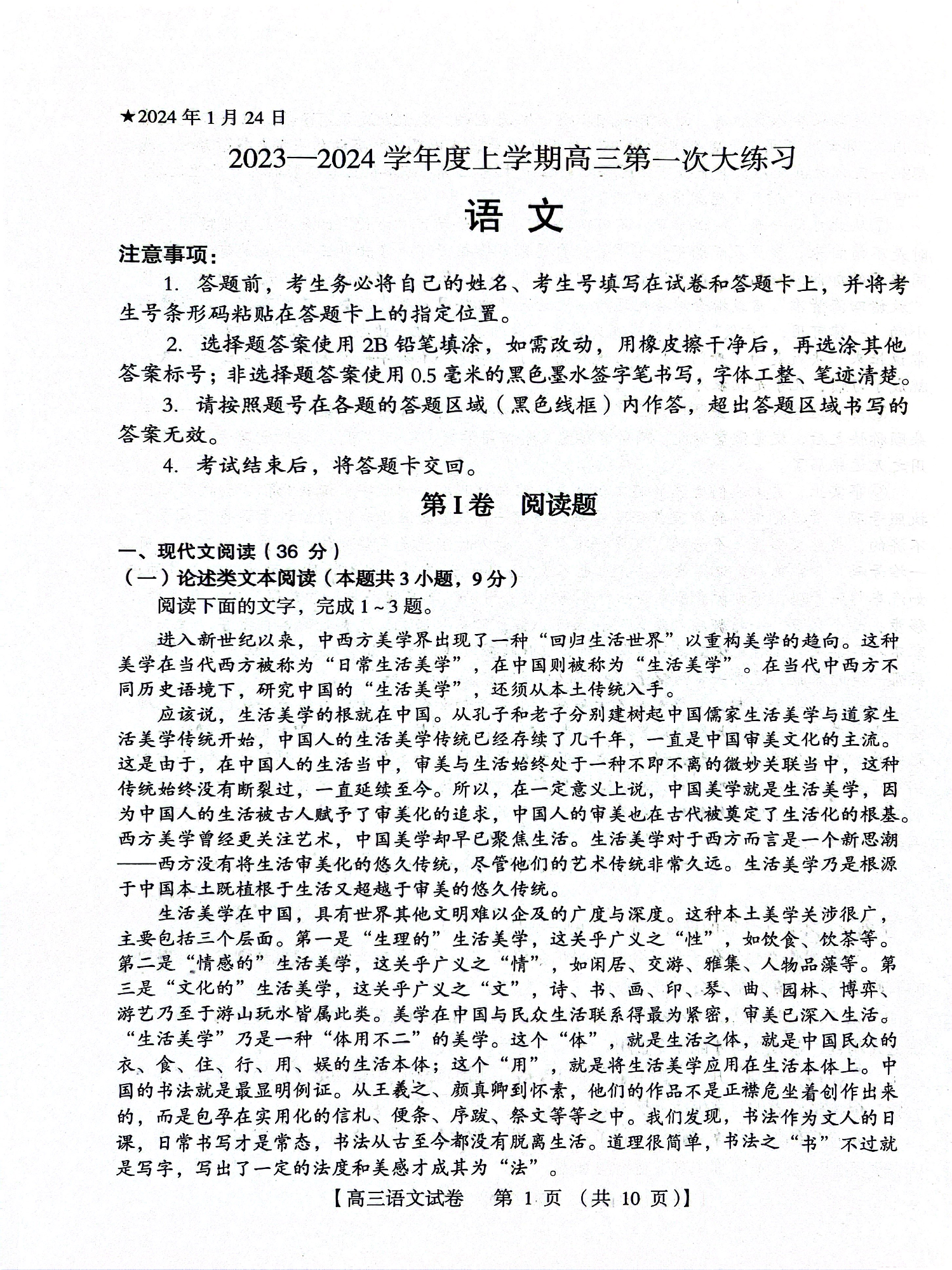 河南省三门峡市2023-2024学年高三上学期期末考试语文