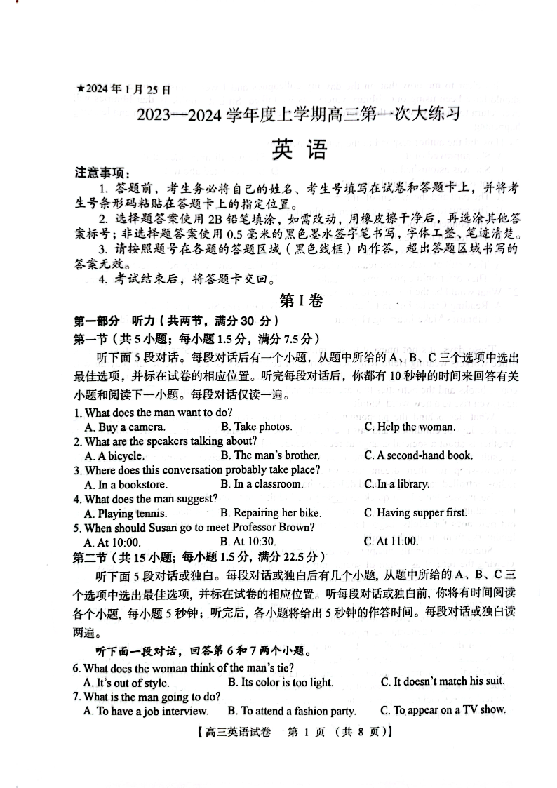 河南省三门峡市2023-2024学年度高三第一次大练习英语