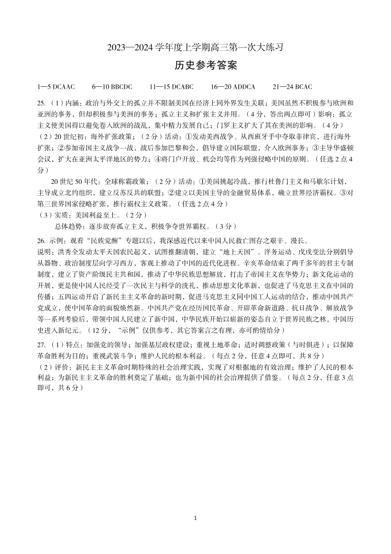 河南省三门峡市2023-2024学年度高三第一次大练习历史参考答案