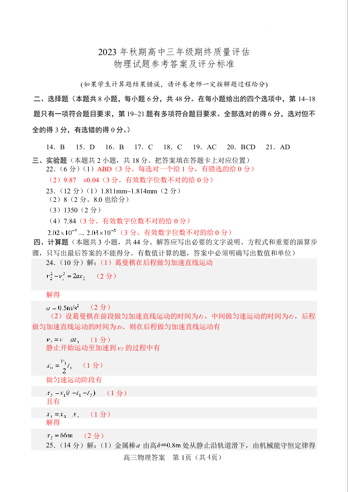 河南省南阳市2024届高三上学期1月期终质量评估物理答案