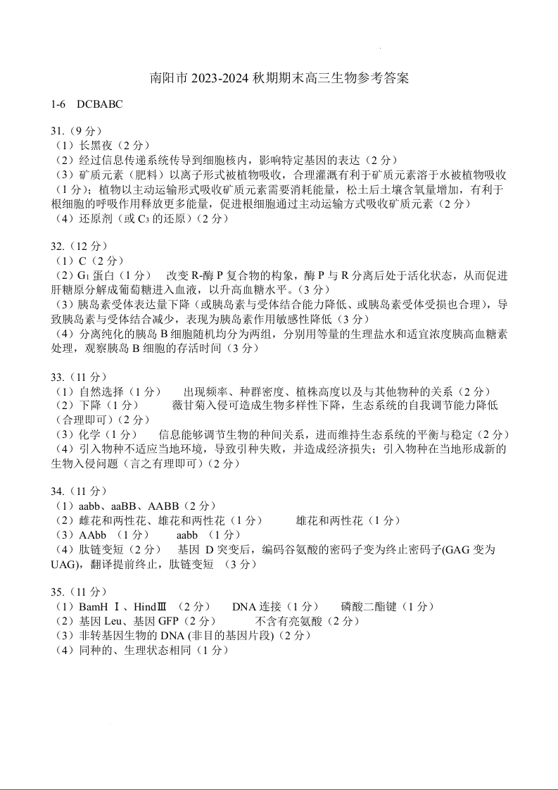 河南省南阳市2024届高三上学期1月期终质量评估生物答案