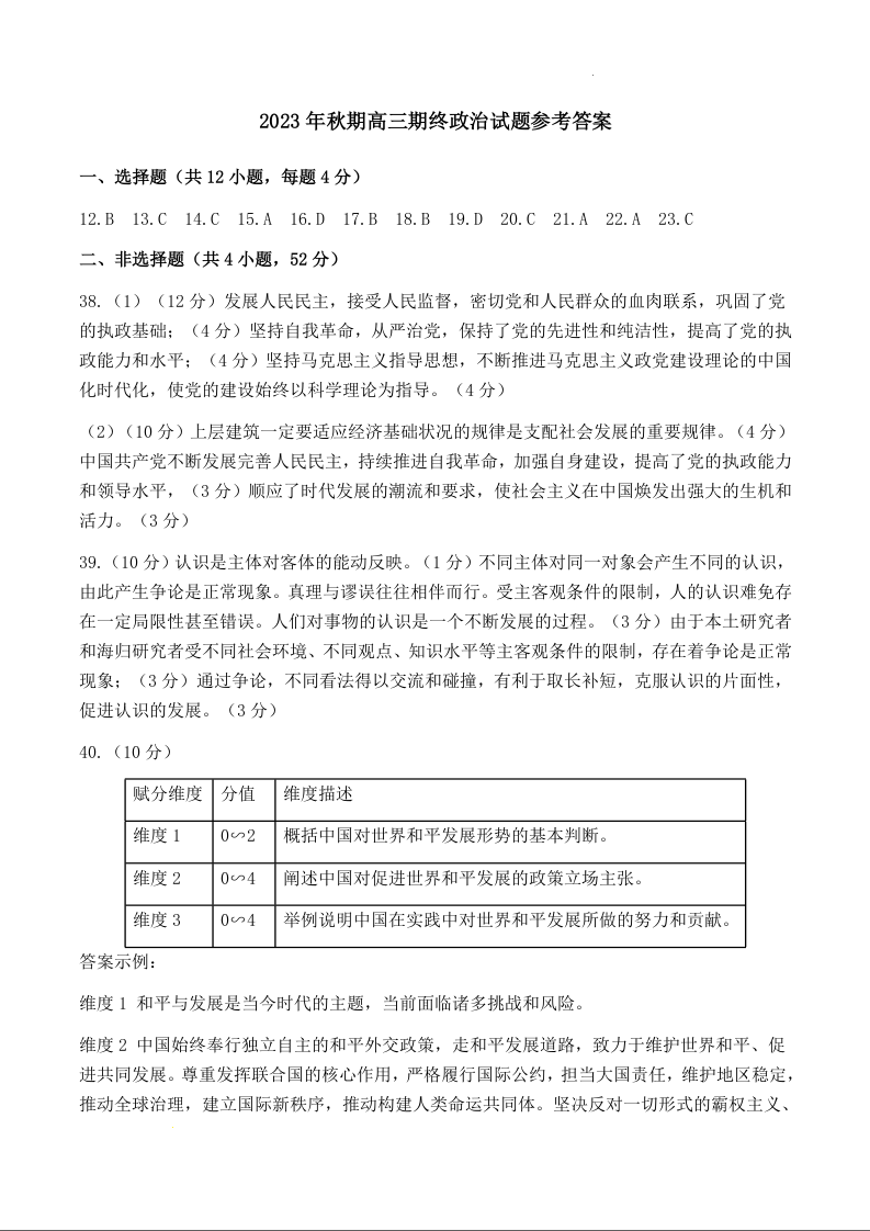 河南省南阳市2024届高三上学期1月期终质量评估政治答案