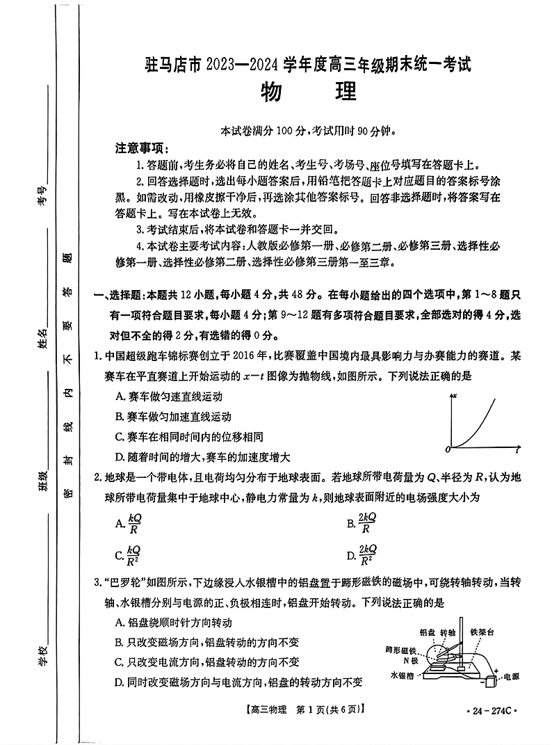河南省驻马店市2024届高三上学期期末考试物理
