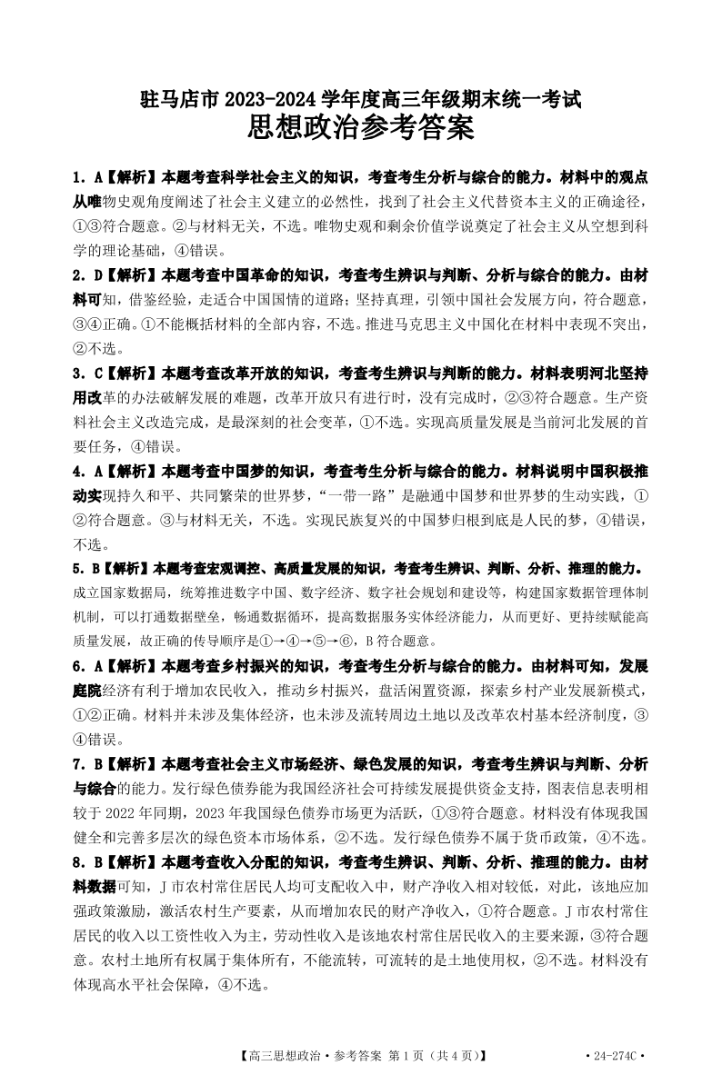 河南省驻马店市2024届高三上学期期末考试政治评分细则