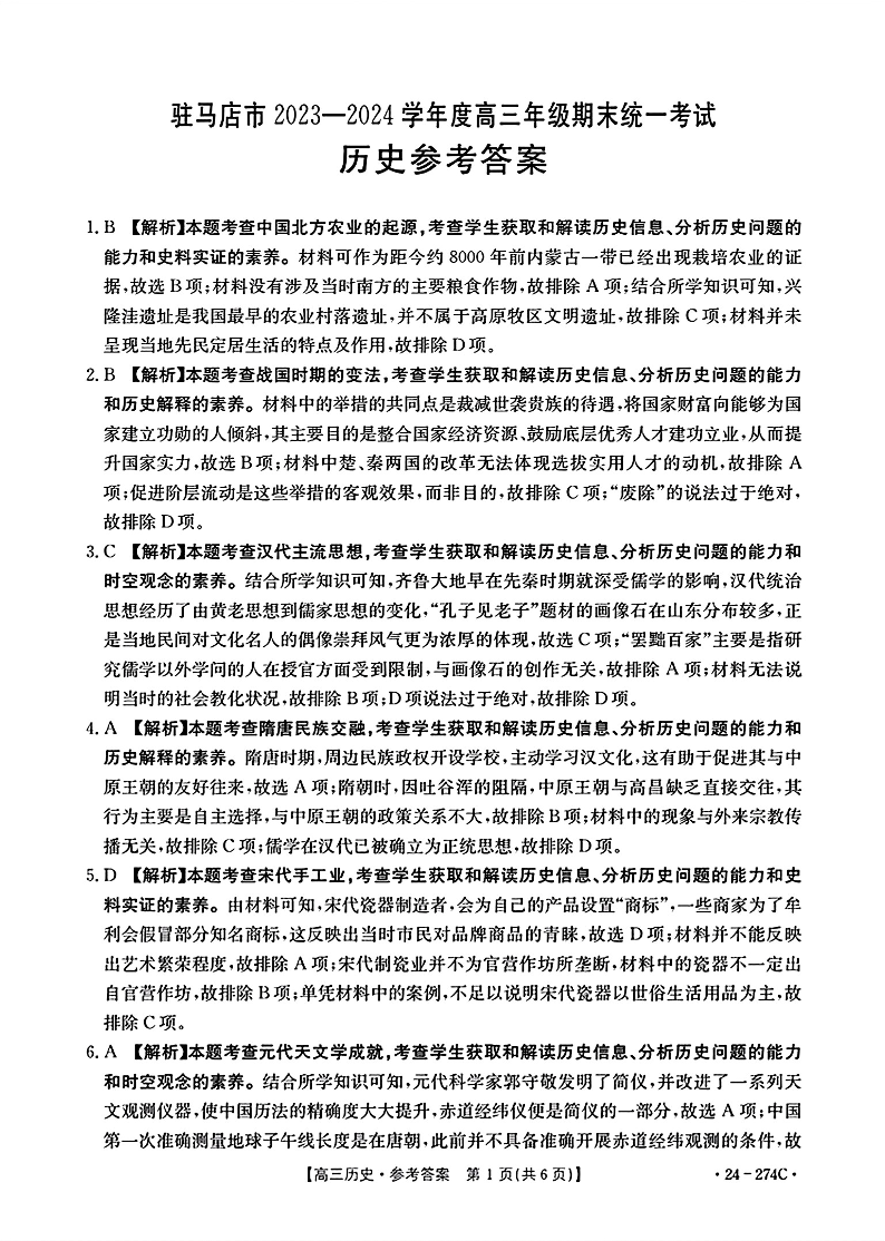 河南省驻马店市2024届高三上学期期末考试历史答案