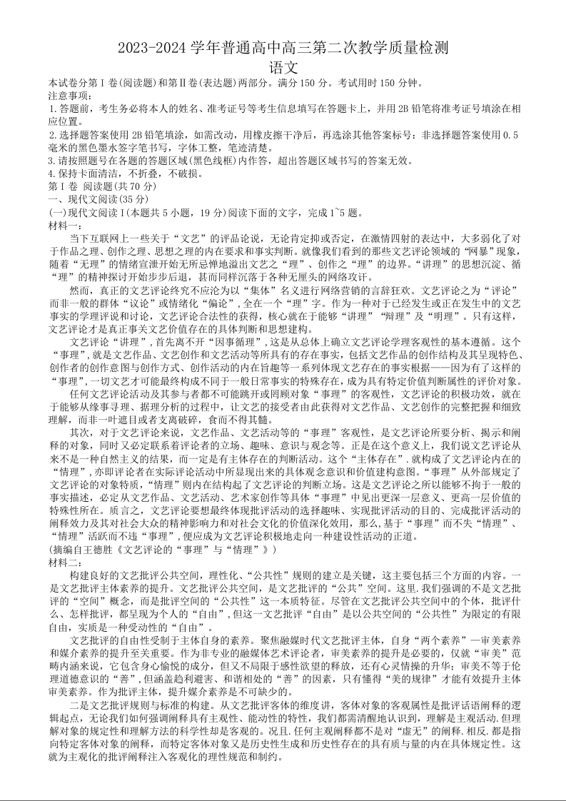 河南省信阳市2024届高三上学期第二次教学质量检测(二模)语文+答案