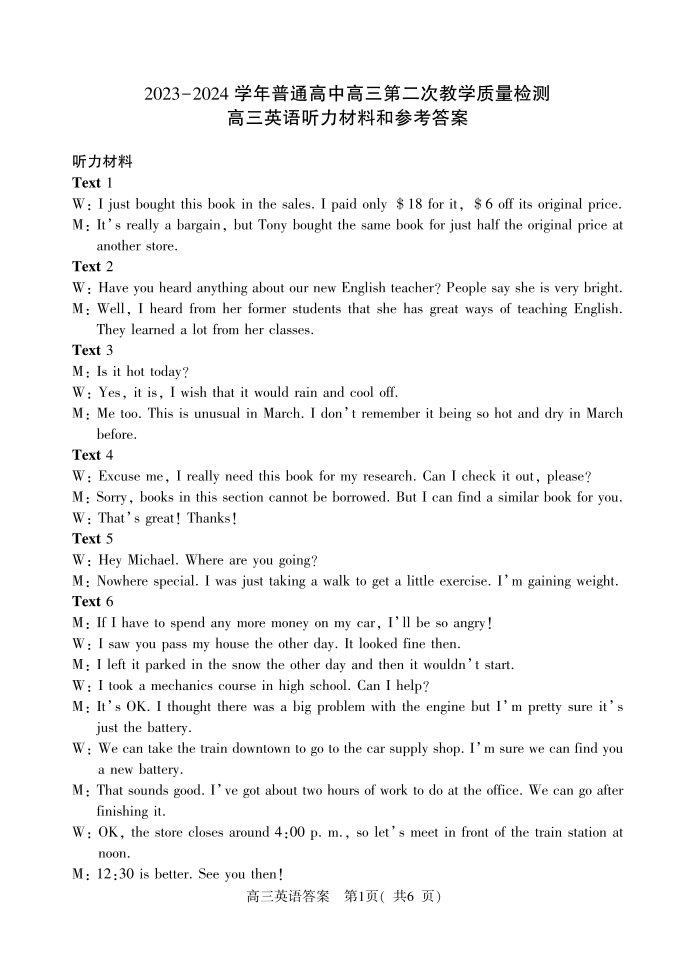 河南省信阳市2023--2024学年普通高中高三第二次教学质量检测英语答案