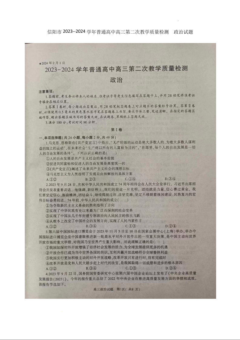 河南省信阳市2024届高三上学期第二次教学质量检测(二模)政治