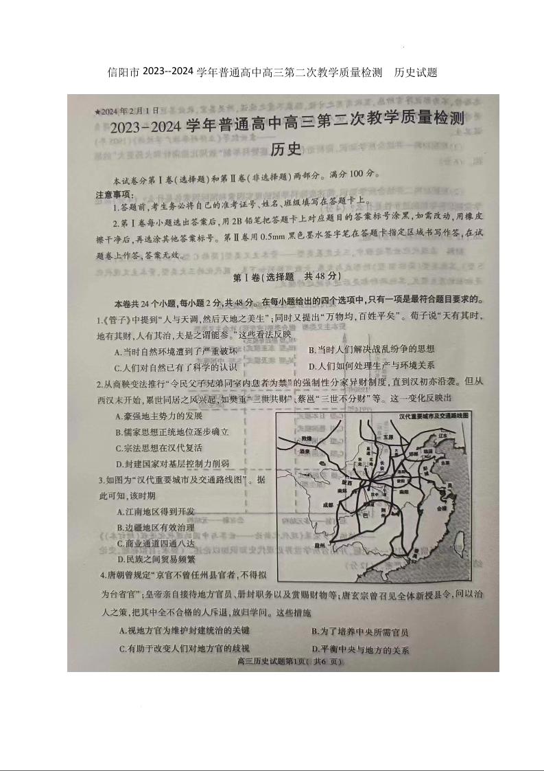 河南省信阳市2023--2024学年普通高中高三第二次教学质量检测历史