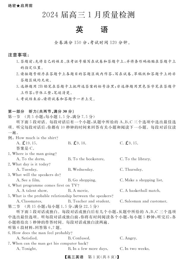 2024届河南省金科大联考高三上学期1月质量检测英语