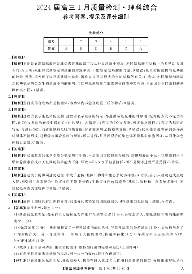 2024届河南省金科大联考高三上学期1月质量检测理科综合答案