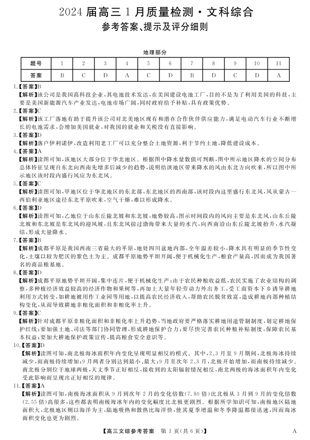 2024届河南省金科大联考高三上学期1月质量检测文科综合答案