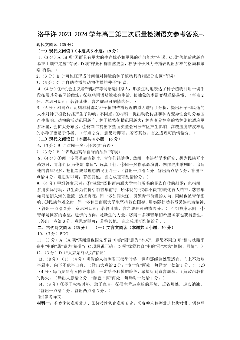 河南省济洛平许四市联考2024届高三下学期3月第三次质量检测语文答案