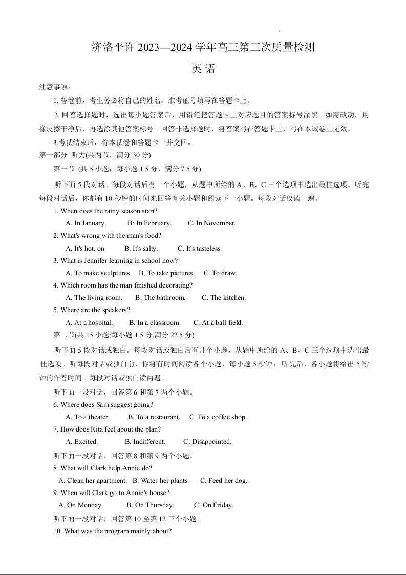 河南省济洛平许四市联考2024届高三下学期3月第三次质量检测英语+答案
