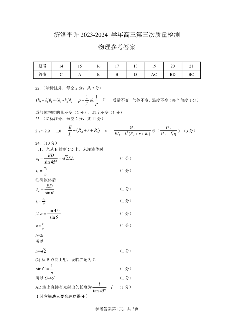 河南省济洛平许四市联考2024届高三下学期3月第三次质量检测物理答案