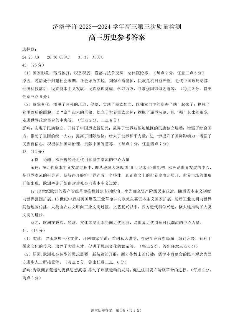 河南省济洛平许四市联考2024届高三下学期3月第三次质量检测历史答案