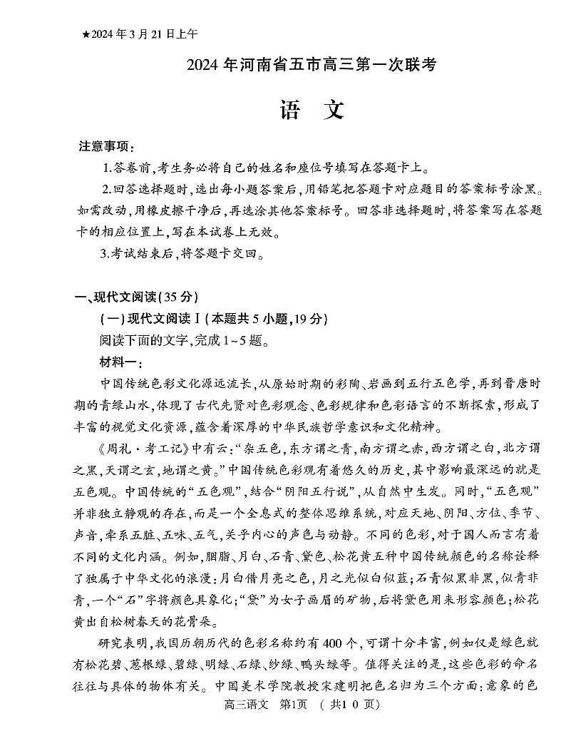 2024届河南省五市高三第一次联合调研检测(三模)语文