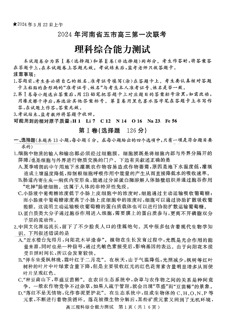 2024届河南省五市高三下学期第一次联考理科综合
