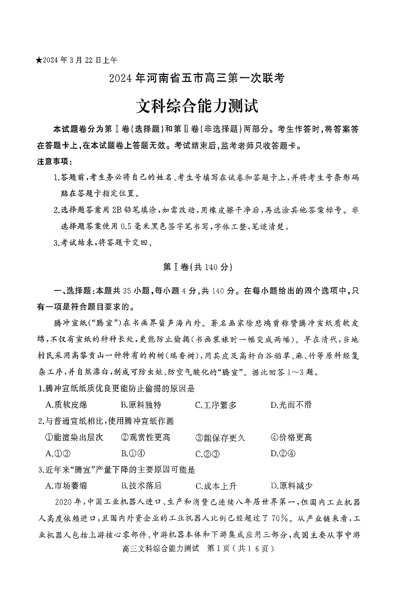 2024届河南省五市高三下学期第一次联考文科综合