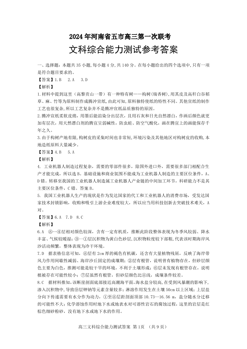 2024届河南省五市高三下学期第一次联考文科综合答案
