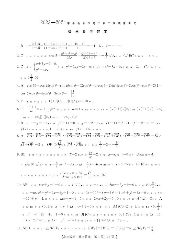2024届河南省新乡市高三下学期第二次模拟考试数学答案