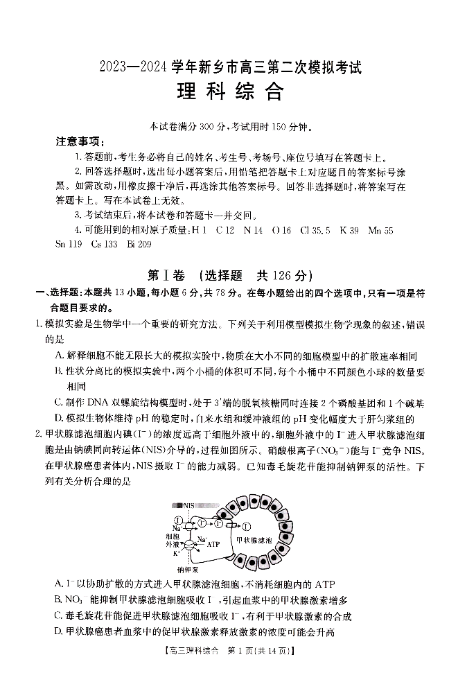 2024届河南省新乡市高三下学期第二次模拟考试理科综合