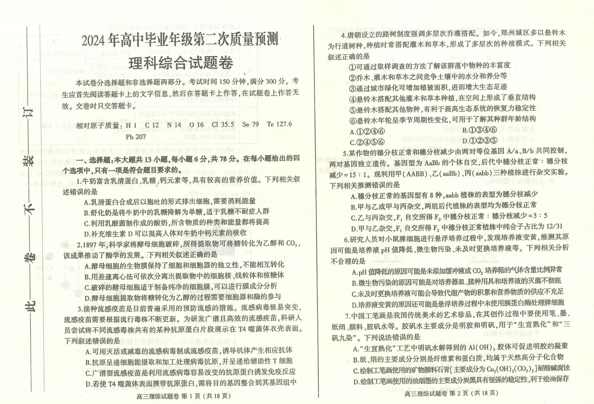2024届河南省郑州市周口市高三下学期第二次质量预测理科综合