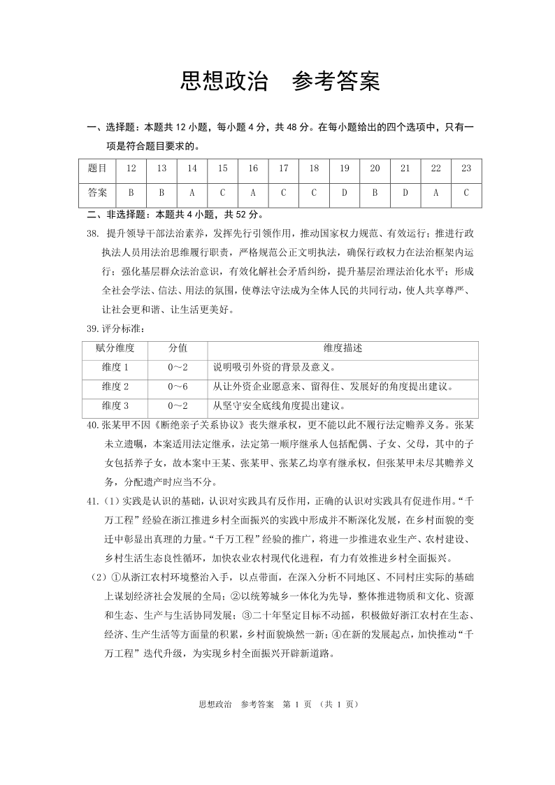 2024届河南省郑州市周口市高三下学期第二次质量预测政治答案