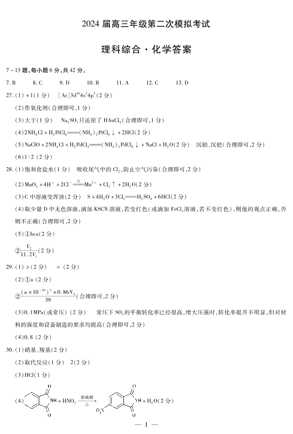 河南省四市2024届高三3月联考(焦作濮阳安阳鹤壁二模)化学简易答案