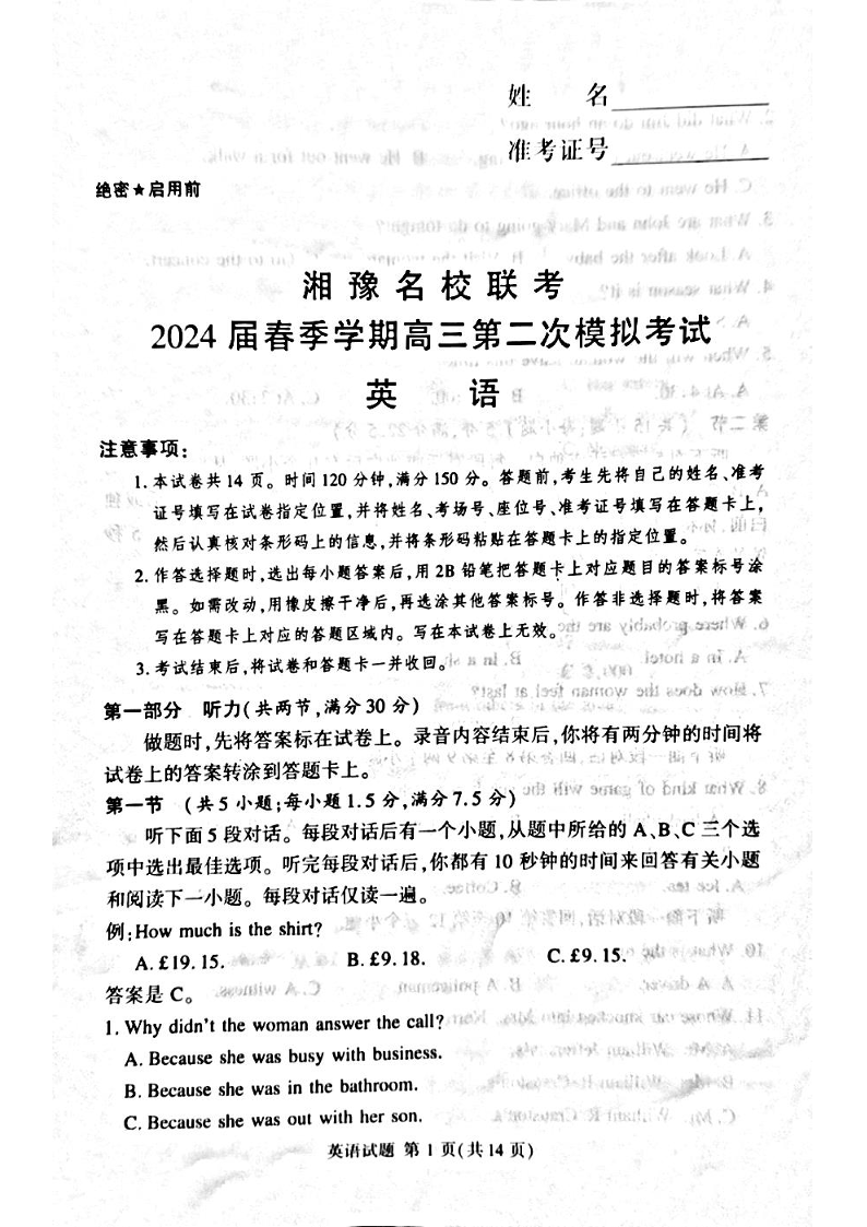 河南省湘豫名校联考2024届高三第二次模拟考试英语