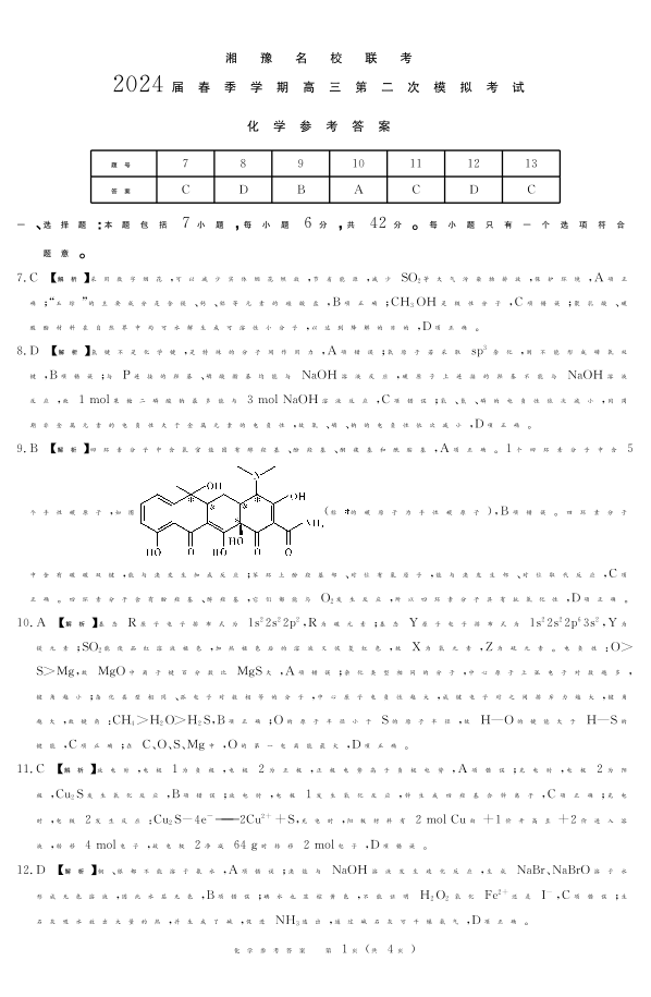 河南省湘豫名校联考2024届高三第二次模拟考试化学答案