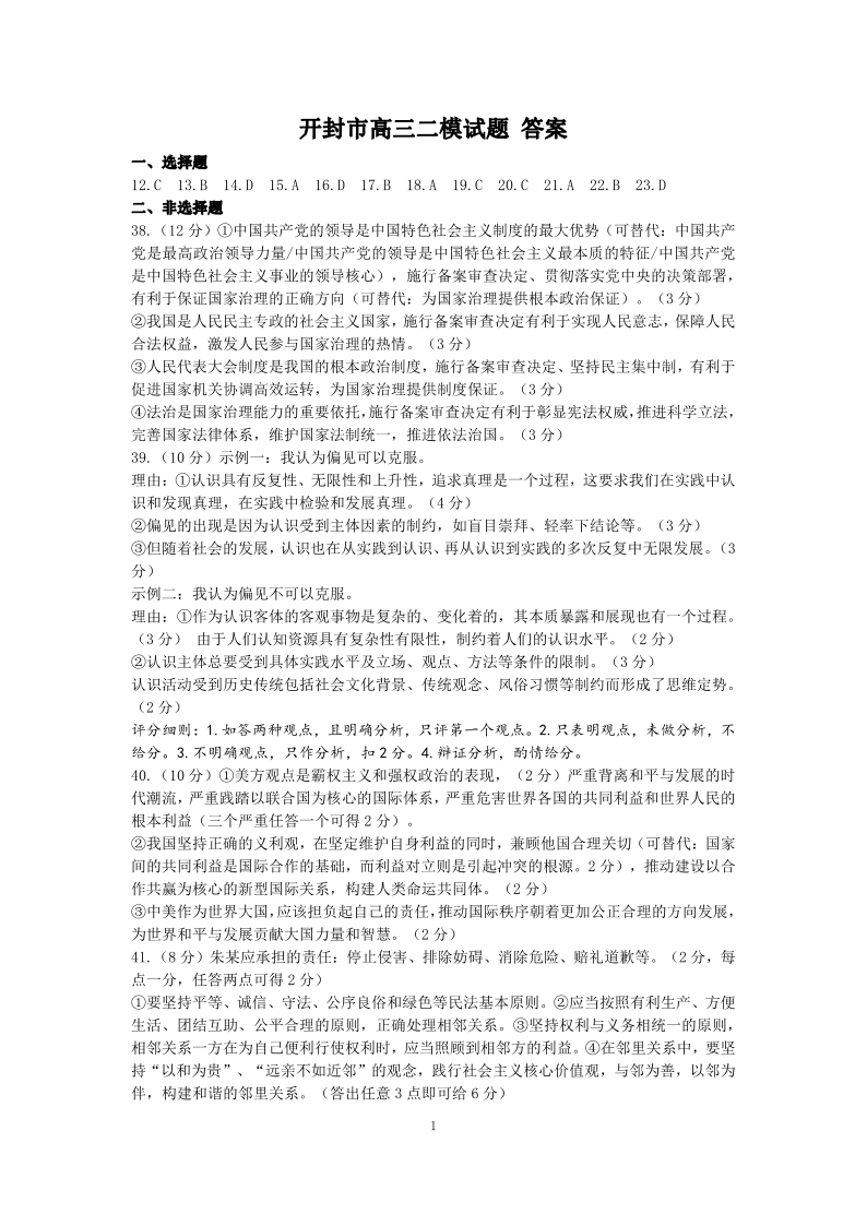 2024届河南省开封市高三下学期第二次质量检测政治答案