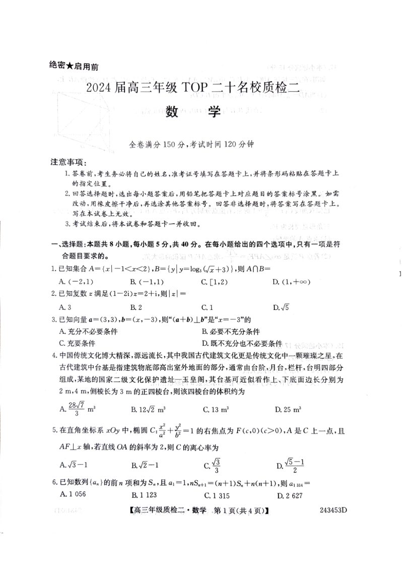 2024届河南省创新联盟TOP二十名校质检二(二模)数学+答案