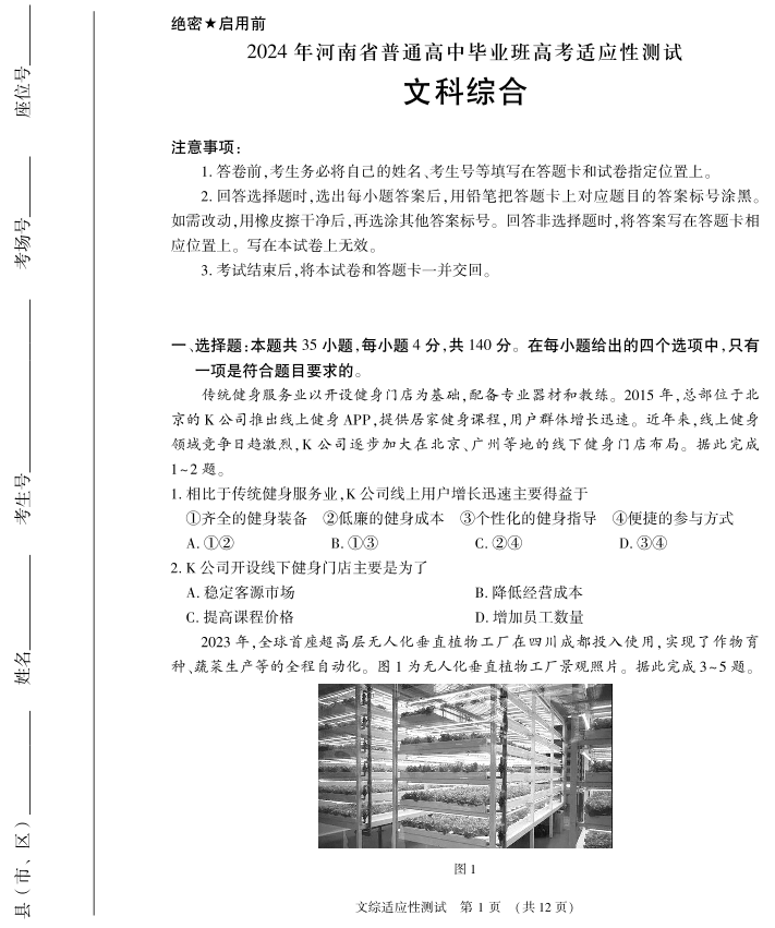 2024届河南省普通高中毕业班高考适应性测试文科综合