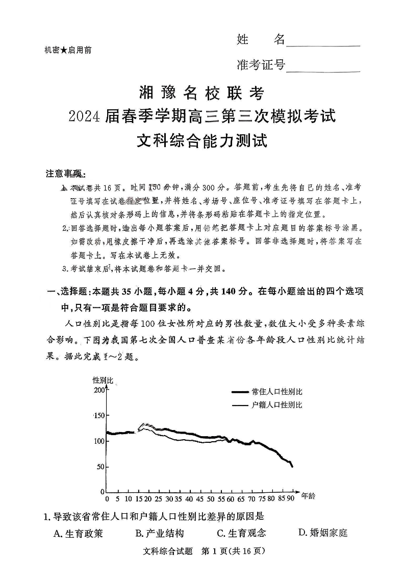 河南省湘豫名校联考2024届春季学期高三第三次模拟考试文科综合