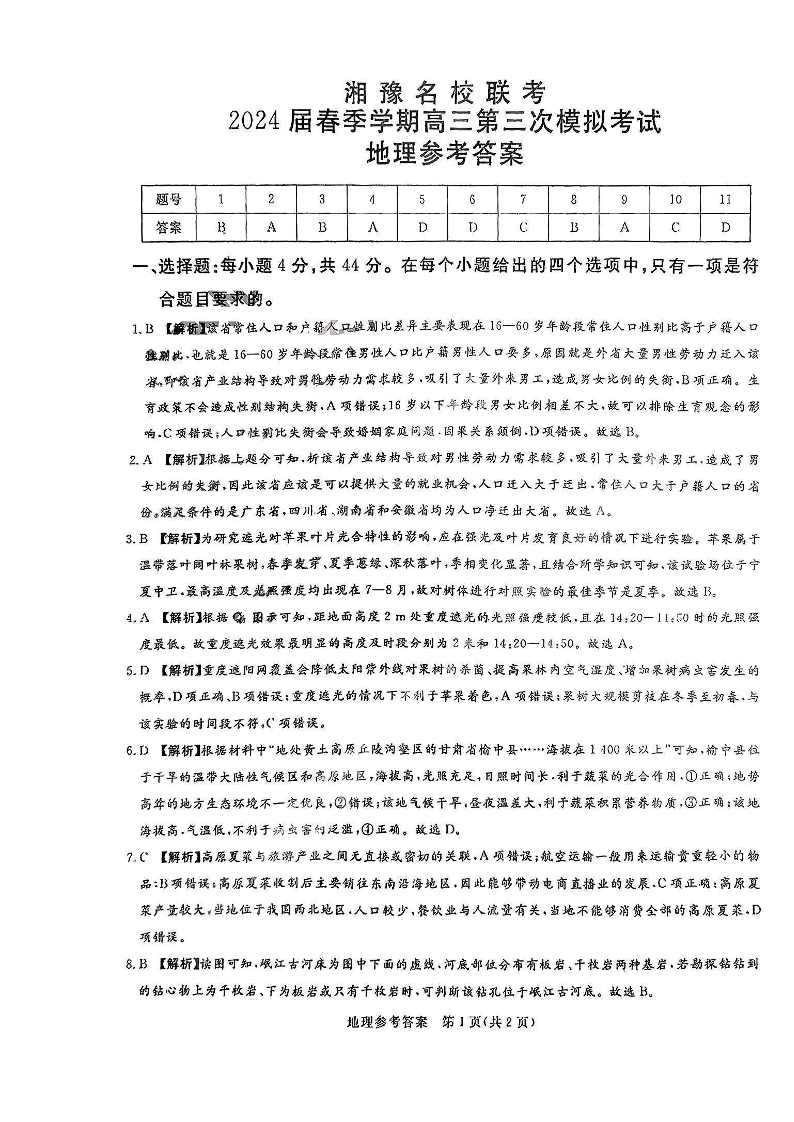 河南省湘豫名校联考2024届春季学期高三第三次模拟考试文科综合答案