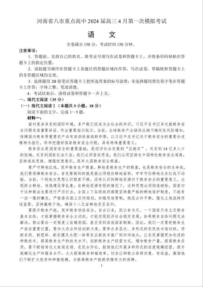 河南省八市重点高中2024届高三4月第一次模拟语文