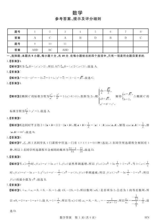 河南省八市重点高中2024届高三4月第一次模拟数学答案